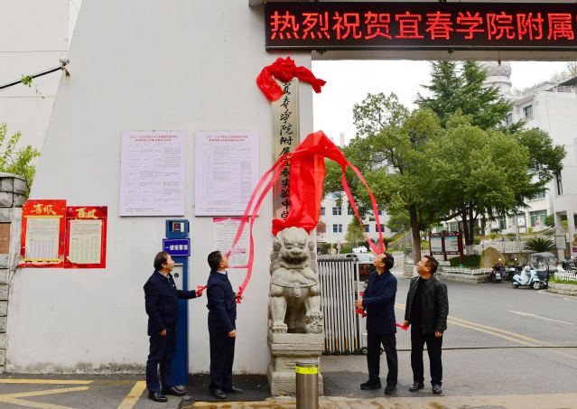 仪式现场,校党委委员、副校长李建军与宜春实验中学党委书记周细荣签订合作协议书,与会领导共同为“宜春学院附属宜春实验中学”揭牌。